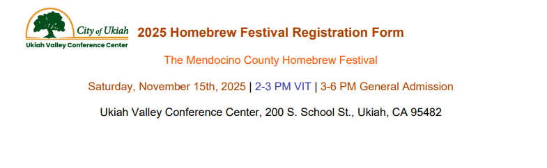 CALLING ALL HOMEBREWERS! A Homebrew Festival needs Homebrewers – Interested in entering your homebrewed specials? Below you can access entry registration form that can be completed and emailed to conferencecenter@cityofukiah.com.